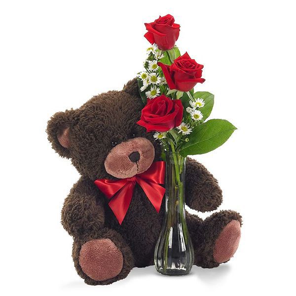 Ürün Kodu: CCK3Vazoda 3 Kırmızı gül ve yeşillikler bulunmaktadır. Yanında sevimli ayıcık bulunmaktadır.